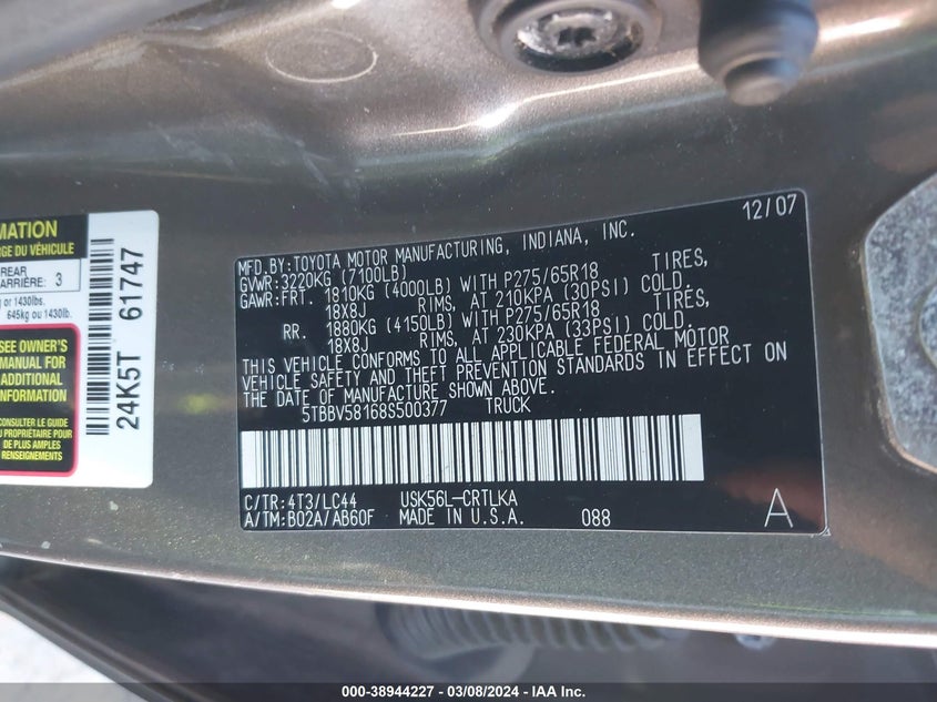 TOYOTA TUNDRA 2008 LIMITED 5.7L V8 Gray 5.7L V-8 DOHC, VVT, 381HP VIN: 5TBBV58168S500377