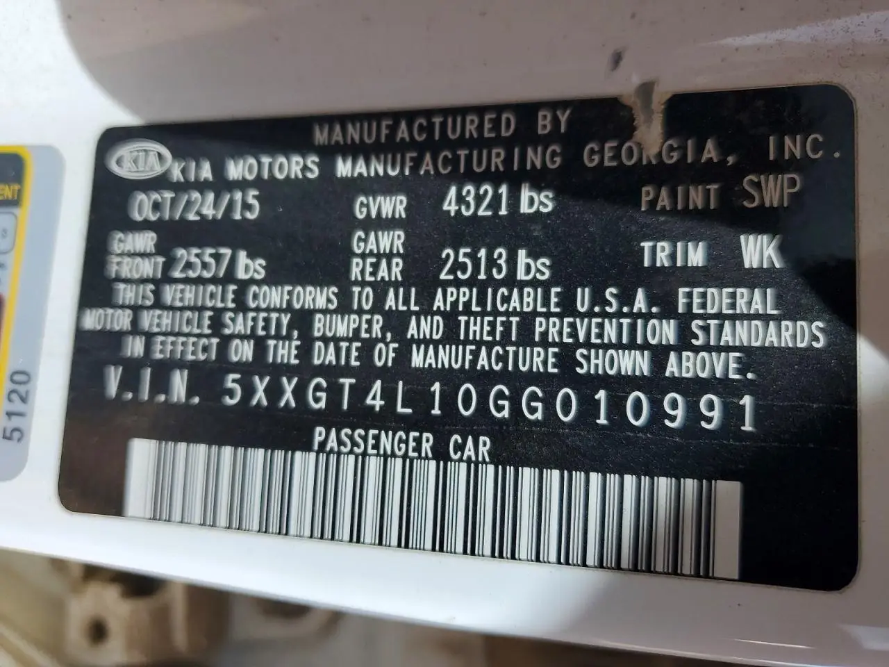KIA OPTIMA 2016 LX WHITE 1.6L 4 VIN: 5XXGT4L10GG010991