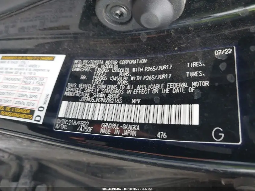TOYOTA 4RUNNER 2022 SR5 Black 4.0L V-6 DOHC, VVT, 270HP VIN: JTEMU5JR2N6082183