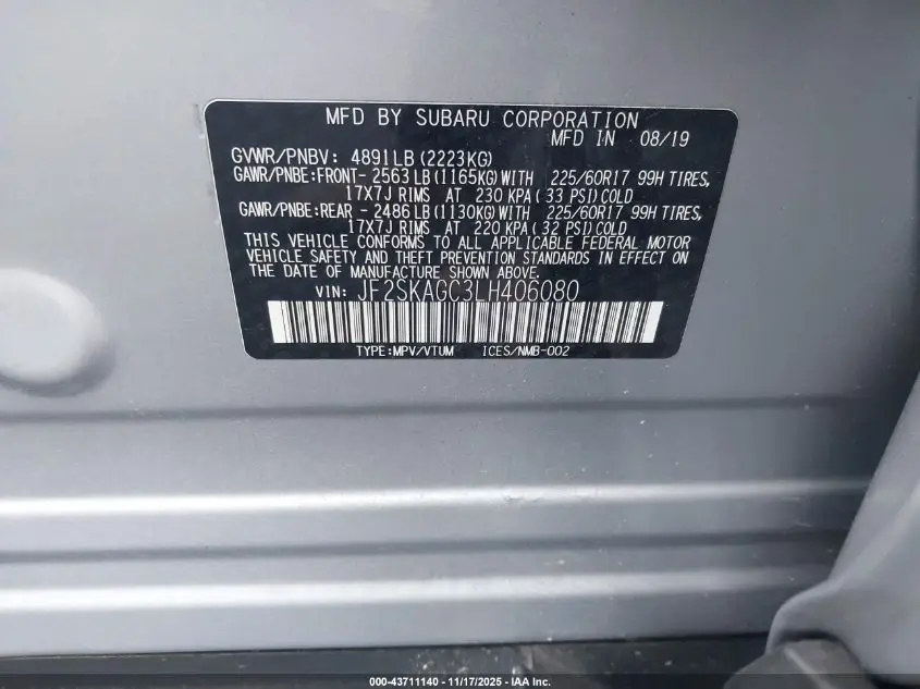 SUBARU FORESTER 2020 PREMIUM 2.5L H-4 DI, DOHC, VVT, 182HP VIN: JF2SKAGC3LH406080