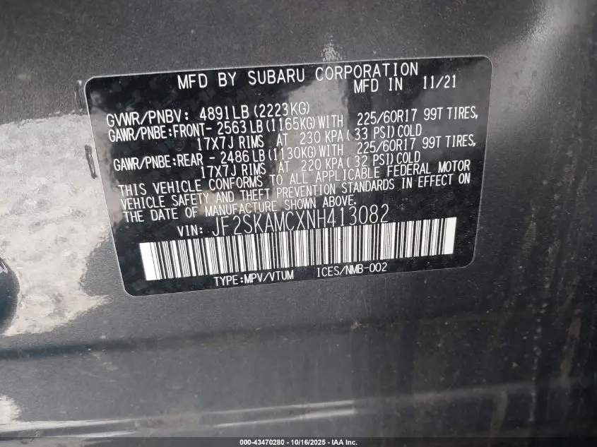SUBARU FORESTER 2022 WILDERNESS Gray 2.5L H-4 DI, DOHC, VVT, 182HP VIN: JF2SKAMCXNH413082