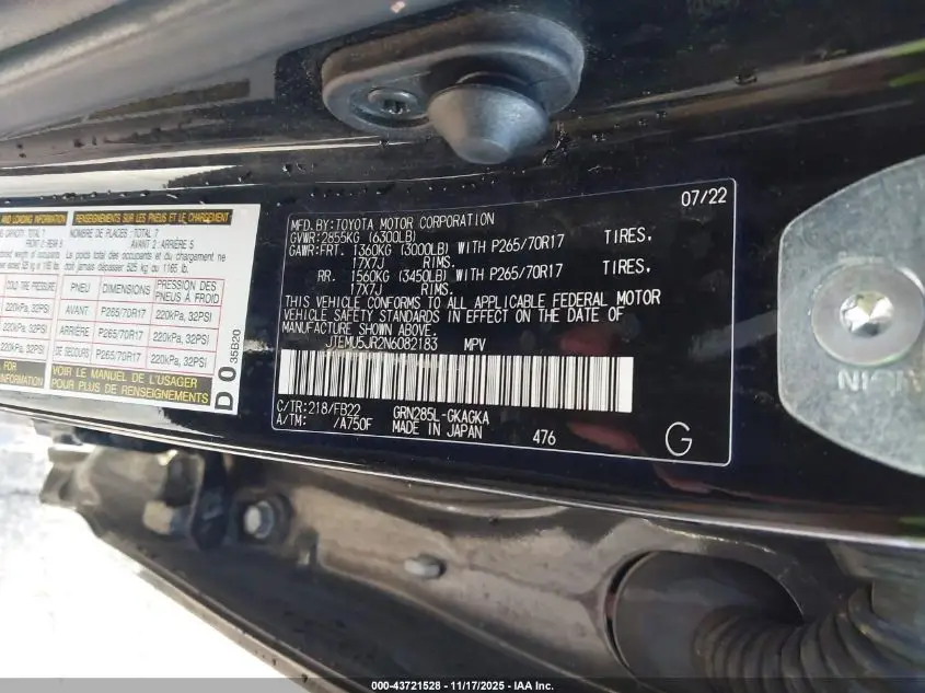 TOYOTA 4RUNNER 2022 SR5 Black 4.0L V-6 DOHC, VVT, 270HP VIN: JTEMU5JR2N6082183