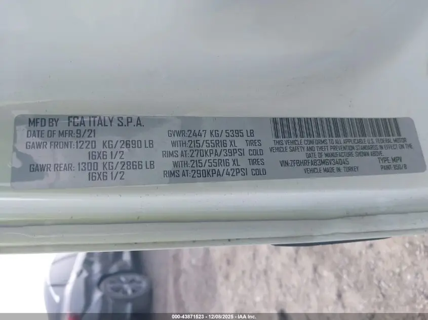 RAM PROMASTER CITY 2021 TRADESMAN White 2.4L I-4 DOHC, VVT, 178HP VIN: ZFBHRFAB3M6V34045