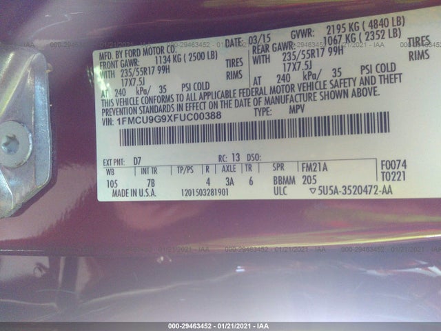 FORD ESCAPE 2015 SE 2.0L I4 FI DOHC 16V NF4 VIN: 1FMCU9G9XFUC00388
