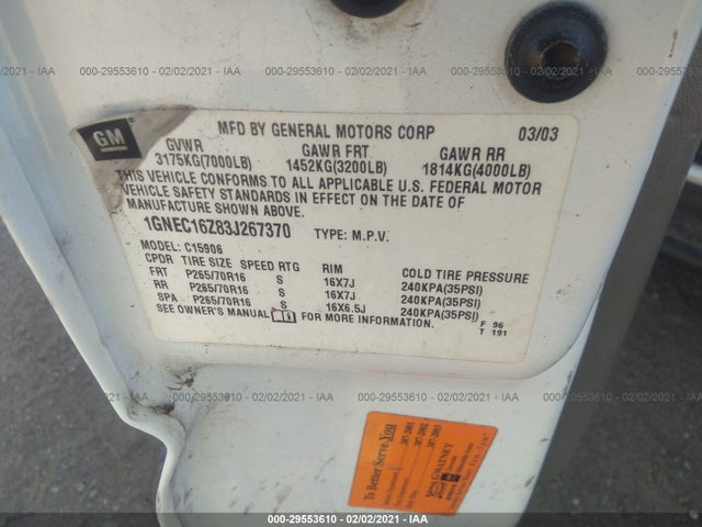 CHEVROLET SUBURBAN 2003 1/2 TON 5.3L V8 FI F VIN: 1GNEC16Z83J267370