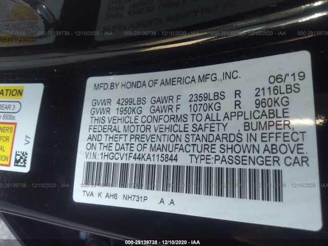 HONDA ACCORD SEDAN 2019 EX 1.5T I-4 DOHC 16-Valve VIN: 1HGCV1F44KA115844