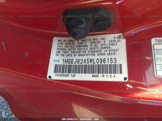 HONDA CIVIC 1998 EX 1.6L SOHC VTEC aluminum-alloy VIN: 1HGEJ8245WL096153