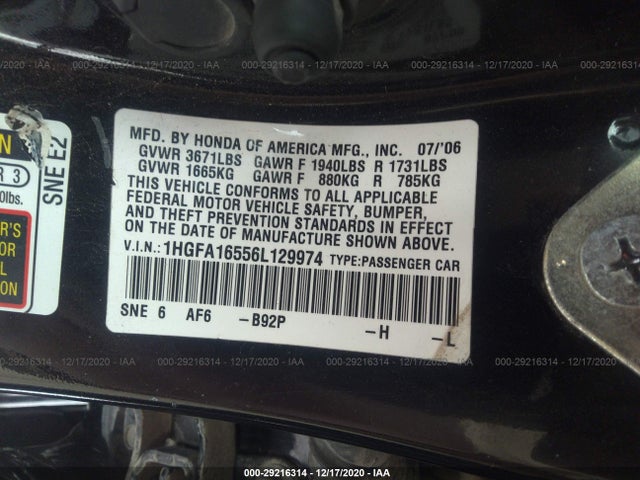 HONDA CIVIC SDN 2006 LX 1.8L SOHC MPFI 16-valve VIN: 1HGFA16556L129974
