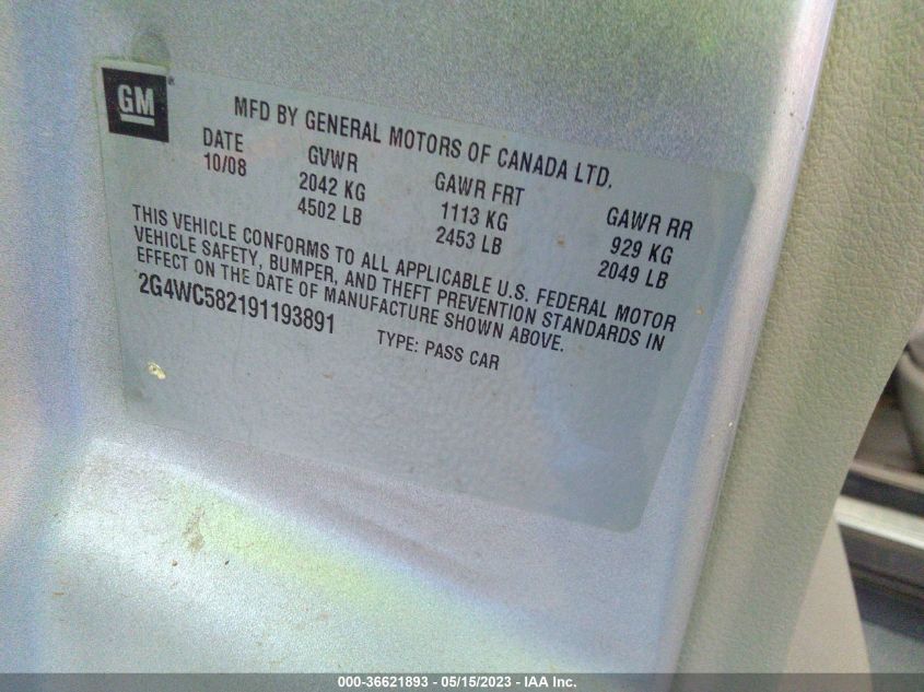 BUICK LACROSSE 2009 CX Silver 3.8L V6 SFI 200 HP 149.2 KW VIN: 2G4WC582191193891