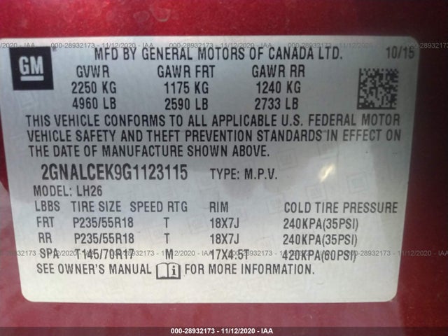 CHEVROLET EQUINOX 2016 LT 2.4L DOHC 4-cylinder SIDI VIN: 2GNALCEK9G1123115