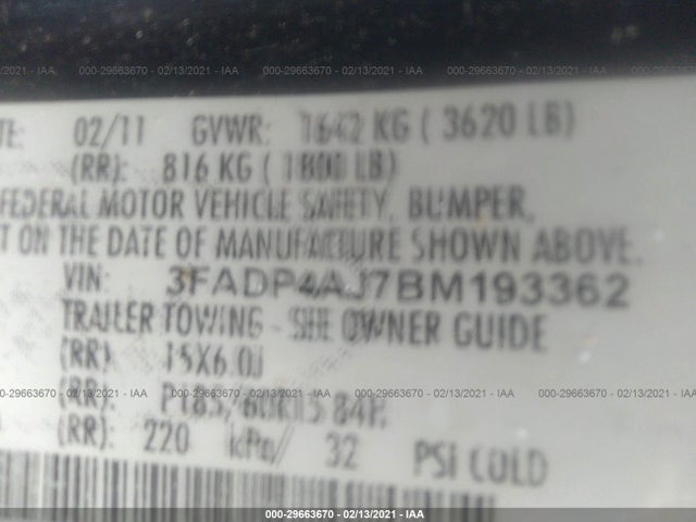 FORD FIESTA 2011 S 1.6L I4 Ti-VCT engine VIN: 3FADP4AJ7BM193362