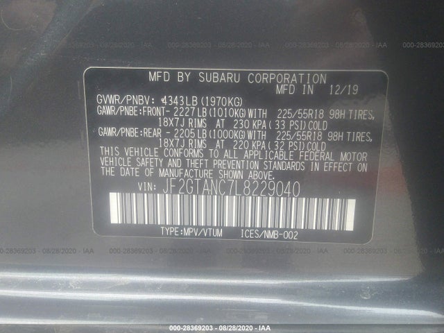 SUBARU CROSSTREK 2020 LIMITED+ES+BSD+NAVI 2.0L DOHC VIN: JF2GTANC7L8229040