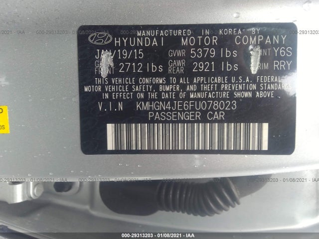 HYUNDAI GENESIS 2015 3.8L 3.8L GDI DOHC V6 w/Dual CVVT VIN: KMHGN4JE6FU078023