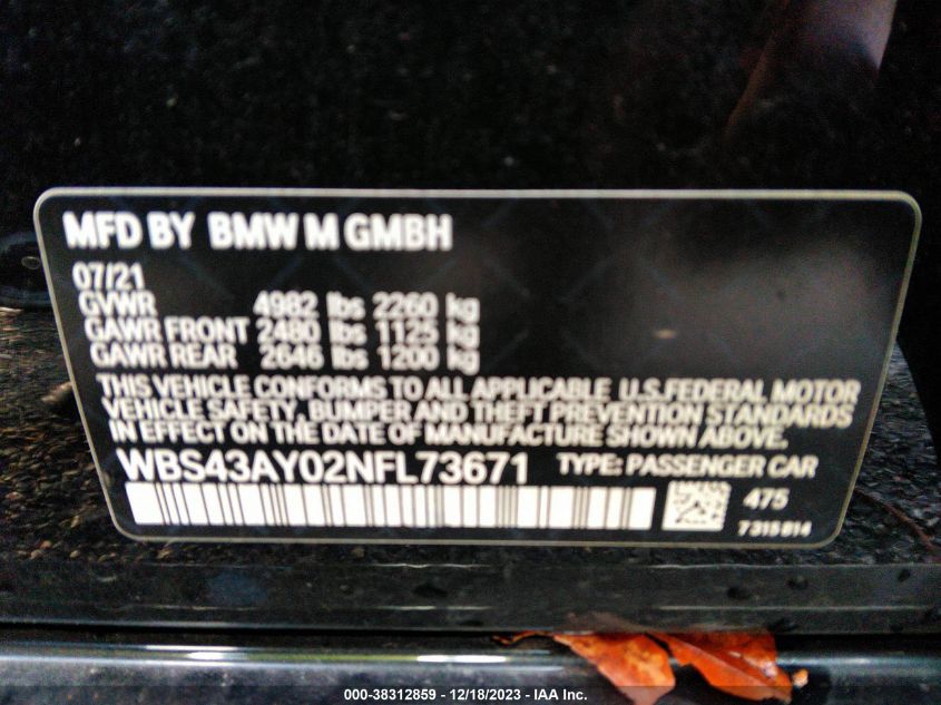 BMW M3 2022 COMPETITION XDRIVE Black 3L I-6 DI, DOHC, VVT, turbo, 503HP VIN: WBS43AY02NFL73671