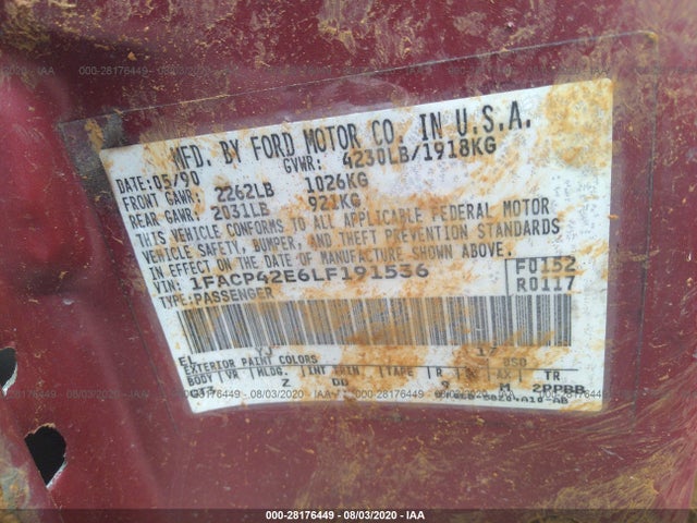 FORD MUSTANG 1990 GT 5.0L V8 FI OHV F VIN: 1FACP42E6LF191536