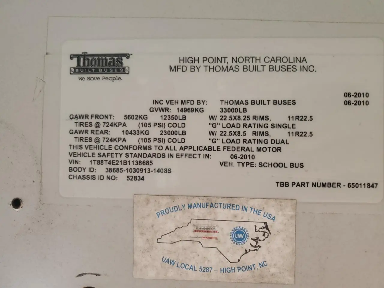THOMAS SAF-T-LINE 2011 R HDX YELLOW 8.9L 6 VIN: 1T88T4E21B1138685