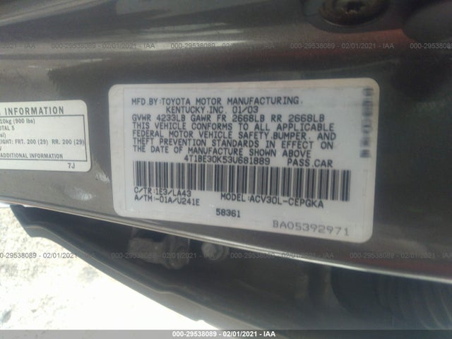 TOYOTA CAMRY 2003 MCV30L/ACV30L 2.4L DOHC VVTi 16-valve 4-cyl VIN: 4T1BE30K53U681889