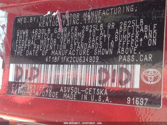 TOYOTA CAMRY 2012 ASV50L/GSV50L/AVV50L 2.5L DOHC VVT-i 16-valve I4 VIN: 4T1BF1FK2CU634909