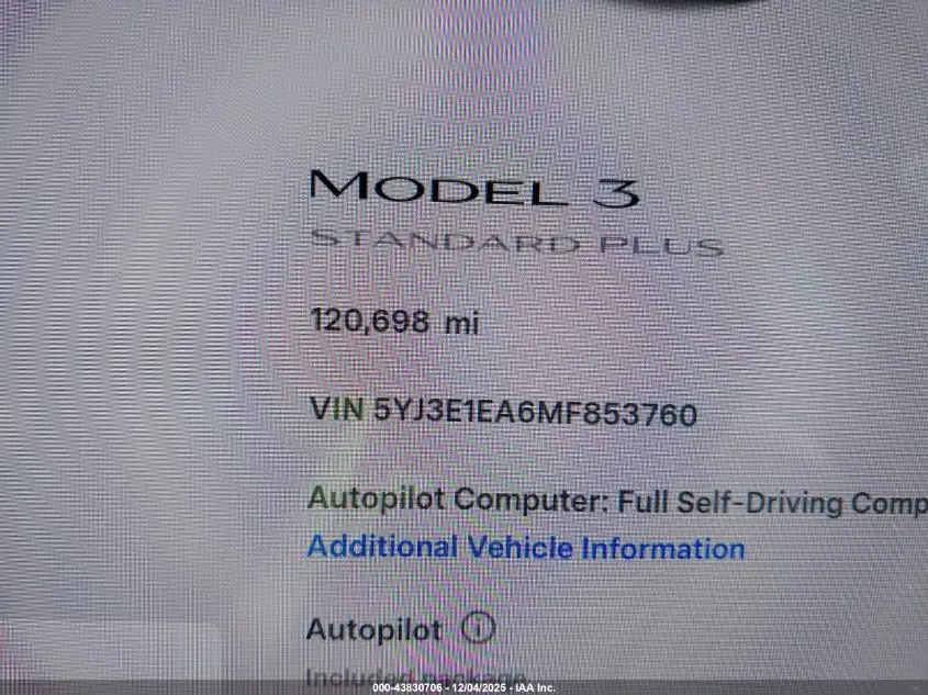 TESLA MODEL 3 2021 STANDARD RANGE PLUS REAR-WHEEL DRIVE U U UX VIN: 5YJ3E1EA6MF853760