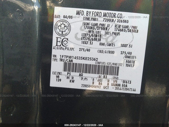 FORD F-150 2005 F-SERIES 5.4L V8 FI SOHC F VIN: 1FTPW14535KE25362