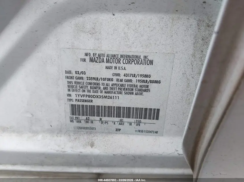 MAZDA MAZDA6 2003 S White 3.0L V-6 DOHC, VVT, 220HP VIN: 1YVFP80DX35M26111