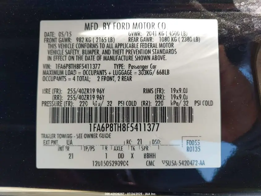 FORD MUSTANG 2015 I4 COUPE 2.3L I4 FI DOHC 16V NF4 VIN: 1FA6P8TH8F5411377
