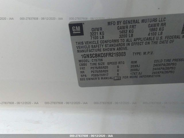 CHEVROLET TAHOE 2015 1/2 TON LT 5.3L EcoTec3 V8 with Active VIN: 1GNSCBKC6FR219303