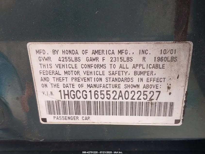 HONDA ACCORD 2002 3.0 EX Green 3.0L V-6 VVT, 200HP VIN: 1HGCG16552A022527