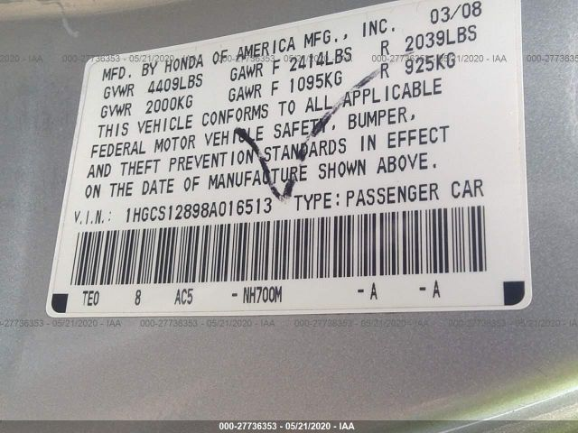 HONDA ACCORD CPE 2008 EX-L 2.4L DOHC MPFI 16-valve VIN: 1HGCS12898A016513