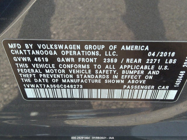 VOLKSWAGEN PASSAT 2016 1.8T R-LINE 1.8L TSI 170 HP Turbocharged VIN: 1VWAT7A35GC048273