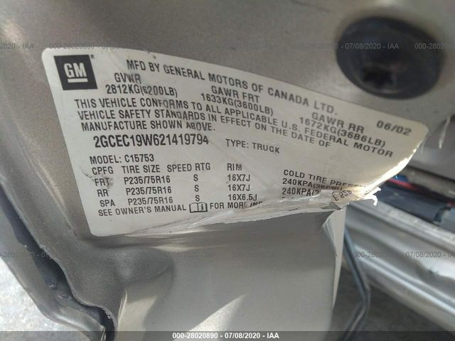 CHEVROLET SILVERADO 1500 2002 1/2 TON 4.3L 262 SFI V6 Vortec engine VIN: 2GCEC19W621419794