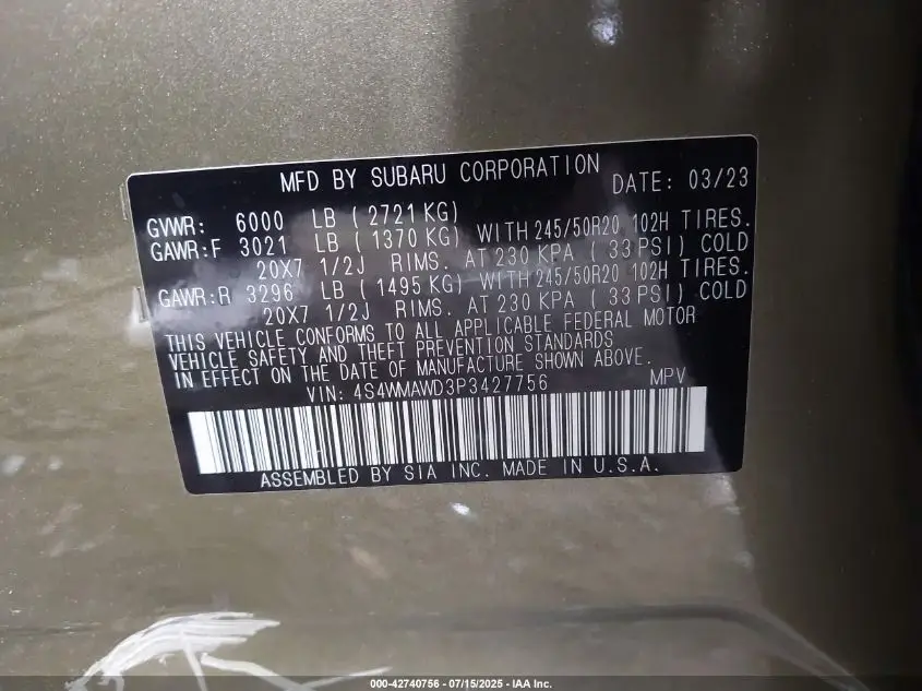 SUBARU ASCENT TOURING ES, SMART, M/R, NAVI(H/K), DMS, MVM 2023