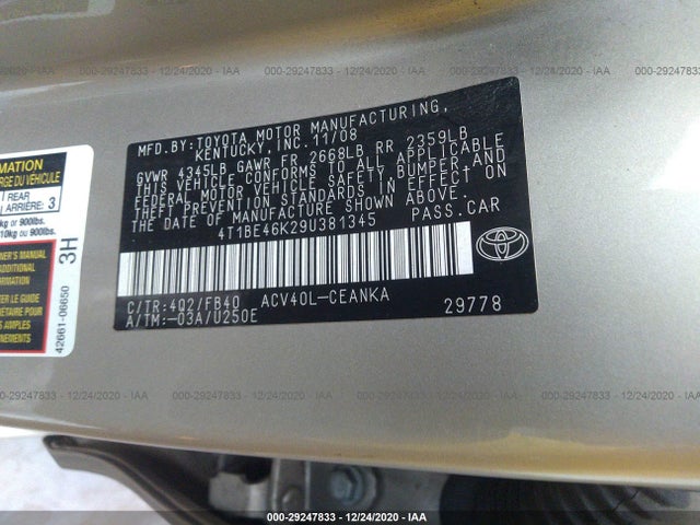 TOYOTA CAMRY 2009 ACV40L/GSV40L/AHV40L 2.4L DOHC VVT-i 16-valve VIN: 4T1BE46K29U381345