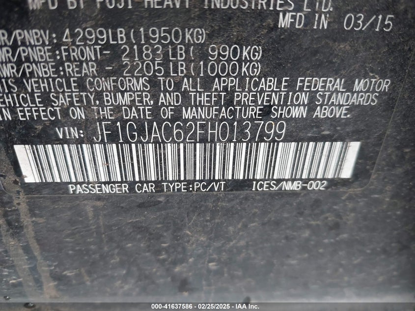 SUBARU IMPREZA 2015 2.0I PREMIUM 2.0L H-4 DOHC, VVT, 148HP VIN: JF1GJAC62FH013799