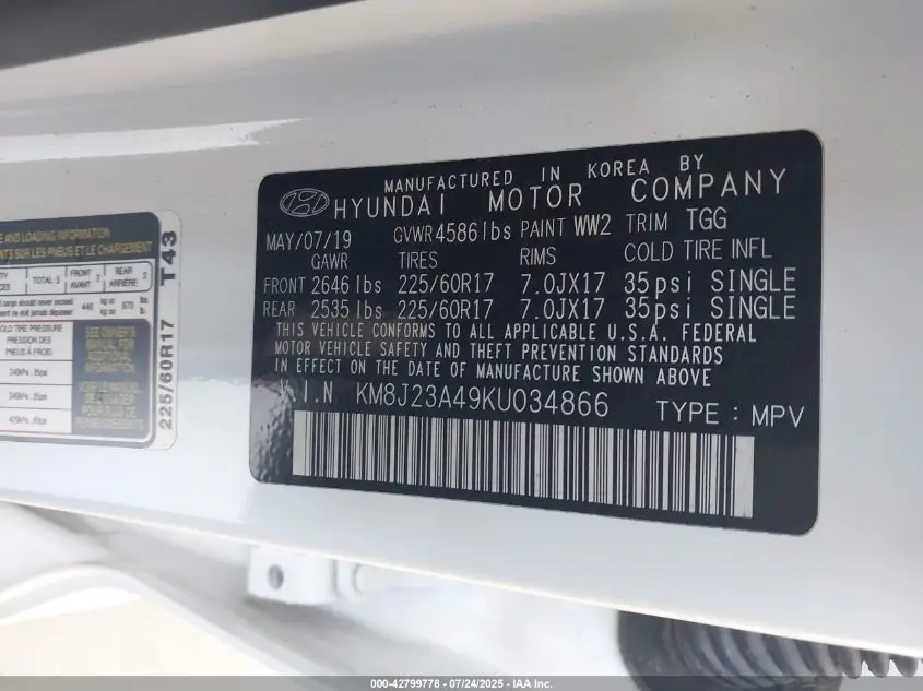 HYUNDAI TUCSON 2019 SE White 2.0L I-4 DI, DOHC, VVT, 161HP VIN: KM8J23A49KU034866