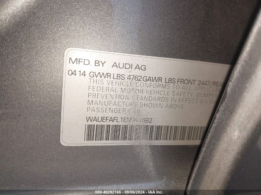 AUDI A4 2014 2.0T PREMIUM Gray 2.0L I-4 DI, DOHC, VVT, turbo, 220HP VIN: WAUEFAFL1EN041692