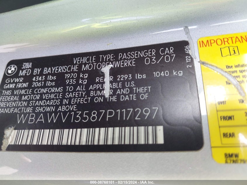 BMW 328I 2007 White 3.0L I-6 DOHC, VVT, 230HP VIN: WBAWV13587P117297