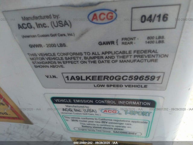 ACGLX GOLF CART 2016 OPEN BODY WITH ROOF (NO DOORS) VIN: 1A9LKEEROGC596591