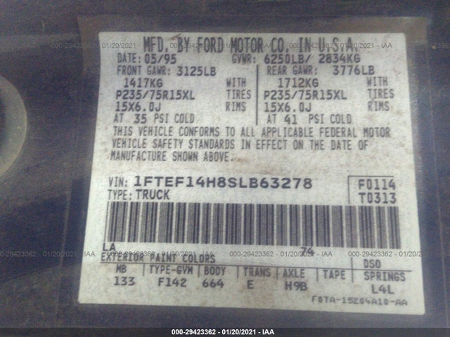 FORD F150 1995 5.8L V8 FI F VIN: 1FTEF14H8SLB63278